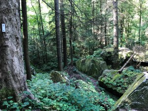 Way more than half of the almost 10-mile loop I did is very rocky and has a lot of roots and similar stuff to trip over. And when I say rocky, I mean picking your way over fields of small boulders, from bowling ball to small car-size. Fortunately, the trail is exceptionally well-marked by blazes on trees. Which is critical for those long stretches with no obvious footpath and you’re depending on looking from one blaze to the next to know where to proceed.