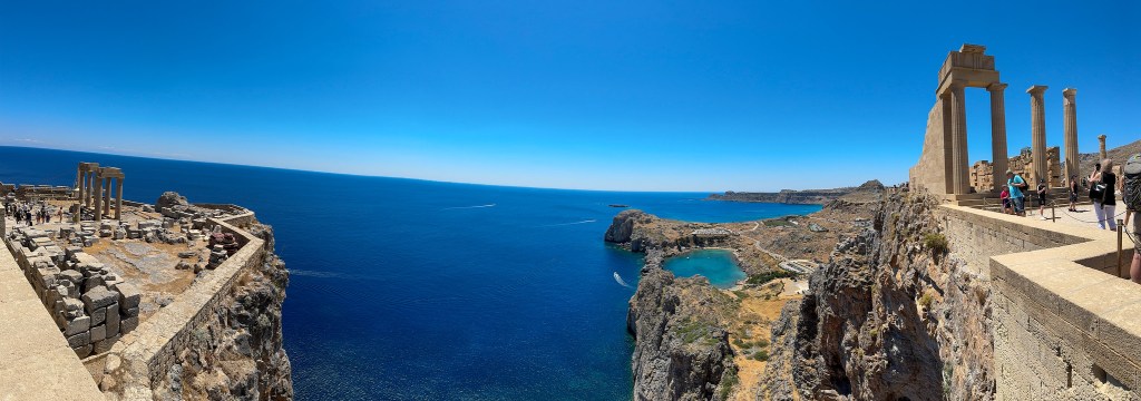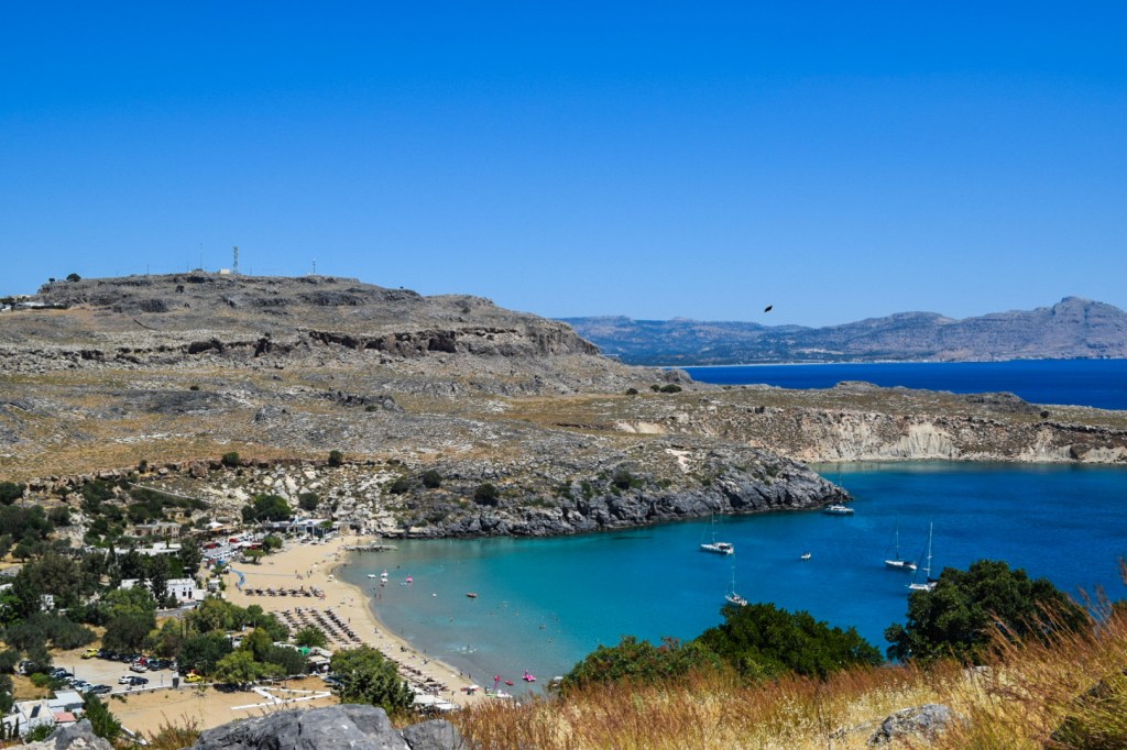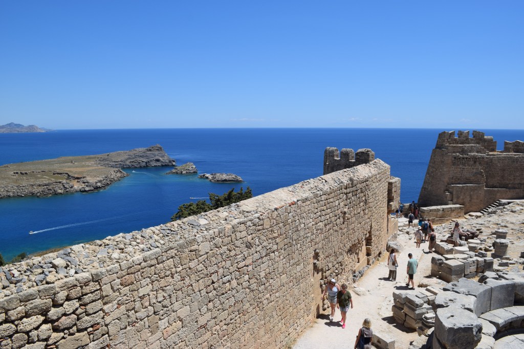 Overlooking the turquoise bay is the Acropolis of Lindos, acropolis being a Greek word often used to refer to a citadel site perched at the highest point of a town.