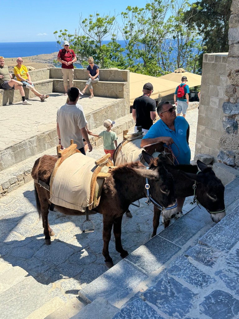 To reach the Lindos Acropolis, you can make the climb on foot or on the back of a donkey. I managed to get there on my own two feet. Bill took advantage of the shade under a tree at the base of the climb to wait for me to return. He found a nice Greek ice cream sandwich to keep him company.