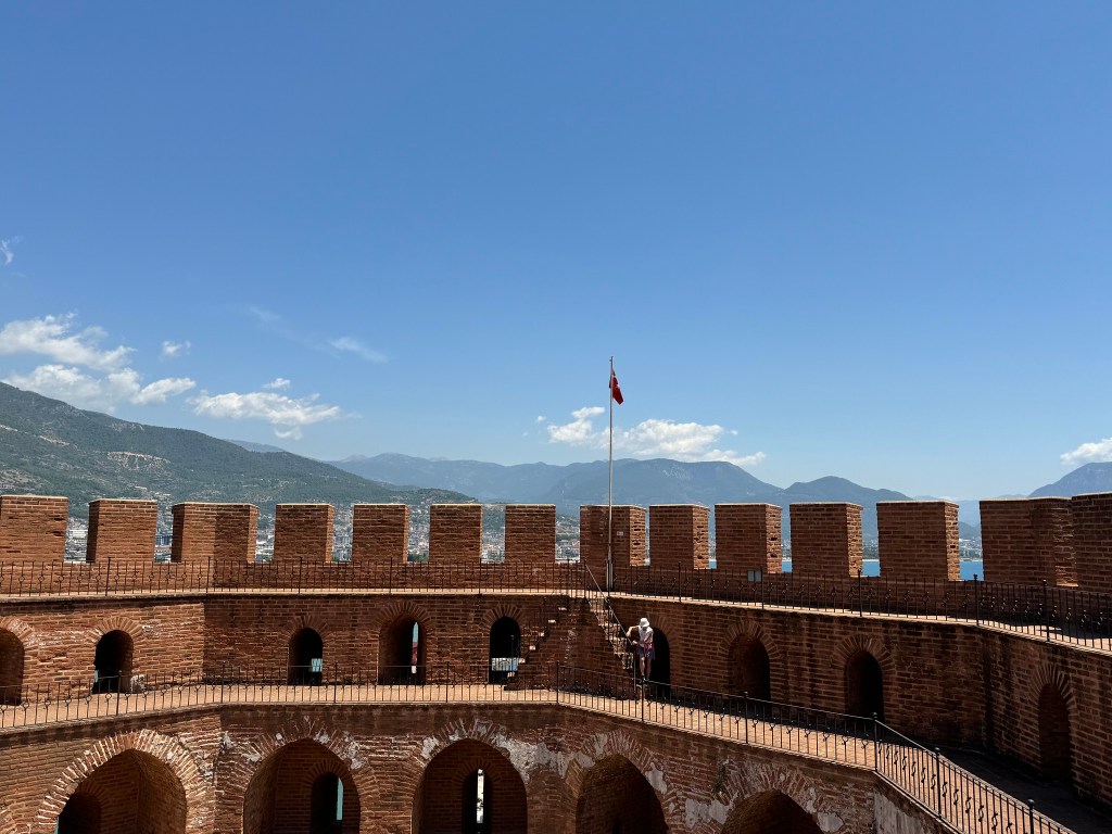 We had a bus to catch to the very tip-top of the city, Alanya Castle, three miles of hairpin turns climbing 1,000’ to a fort turned open-air museum. The castle sits on a rocky bluff looking down on the Red Tower and today includes churches and chapels from the Byzantine Empire and the “Süleymaniye” mosque built in the 13th century.